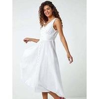 Sleeveless Button Detail Cotton Midi Dress from Roman. Simple and sweet, this 100% cotton sun dress features a feminine v neckline and is cut in a cool, sleeveless style. Crafted from a soft, 100% cotton fabric this piece is breathable and comfortable, making it perfect for warm Summer days. Its waistline creates flattering gathers at the bust and creates soft pleats in the skirt, which falls to a modest midi length. Button detailing adorn the piece running from the neckline down to the hem. Add some br... - Manufacturers part number: WH44E