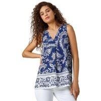 Sleeveless V-Neck Paisley Pleat Front Top from Roman. Carry pretty paisley prints through to the Summer months with this sleeveless printed top. Cut from a smooth woven fabric this piece features a feminine v neckline which is finished with a flattering pleat. Designed in a cool, sleeveless style this piece is adorned in a large paisley print with a contrast border for interest. Pull on overhead and add a pair of light, cropped jeans and sandals for an effortless look! | Roman Women's Sleeveless V-Neck Paisley Pleat Front Top in Navy | Size: 10 - Manufacturers part number: Roman_5063026268910