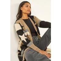 Star Print Longline Stretch Cardigan from Roman. This statement cardigan is sure to be the shining star of your Winter wardrobe this season. This cosy coverup has a classic, edge to edge opening, long sleeves, and a longline shape to flatter any figure. This cardigan is made from a soft yarn, making it perfect for keeping warm during Autumn and Winter. The colour block design adds a fashionable touch to the piece, while the contrasting stars create a fun and festive twist. Pair with a plain tee and jeans for a casual style or treat your loved ones this Christmas! | Roman Women's Star Print Longline Stretch Cardigan Sweater in Natural | Size: 12 - Manufacturers part numbers: 160553p|Roman_5063026426433