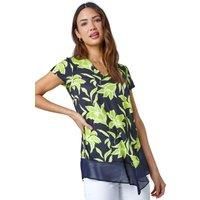 Floral Print V-Neck Chiffon Hem Jersey Top from Roman. Update your wardrobe with this contrast printed tunic top. Cut from a comfy stretch jersey, this style has a lightweight chiffon hem with a contrasting border. The flattering pull on silhouette is adorned with a standout floral print and finished with a floaty asymmetric hem. Designed with short sleeves, a v-neckline and sheer dipped hem, this feminine piece oozes Summer style. Pair with your comfiest cropped trousers and sandals for an effortlessly stylish seasonal look! | Roman Women's Floral Print V-Neck Chiffon Hem Jersey Top in Lime | Size: 10 - Manufacturers part number: Roman_5063026443201