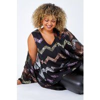 Curve 3/4 Sleeve Sequin Zig Zag Kimono from Roman. Update your partywear collection with this glitzy kimono jacket! The shimmering zig zag sequin embellishment is sure to have you dazzling on the dancefloor this party season. This Curve coverup features an edge to edge opening, 3/4 sleeve silhouette and a floaty wide sleeve. Get special occasion ready by pairing with our matching cami top (20141708) and faux leather trousers! - Manufacturers part number: Roman_5063026563091