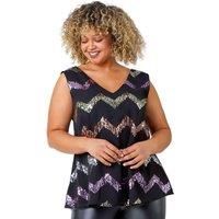 Curve Sequin Zig Zag Cami Top from Roman. Update your partywear collection with this glitzy vest top! The shimmering zig zag sequin embellishment is sure to have you dazzling on the dancefloor this party season. This Curve top features a feminine v-neckline, sleeveless silhouette and a plain woven back. Lining at the front ensures you are comfortable and covered all night long. Get special occasion ready by pairing with our matching kimono (20140808) and faux leather trousers! | Roman Women's Curve Sequin Zig Zag Cami Top in Black | Size: 20 - Manufacturers part number: Roman_5063026563176