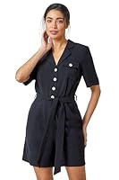 Textured Tie Waist Playsuit from Roman. Introduce some new shapes to your Summer wardrobe this season with this textured, tie waist playsuit. Cut from a textured woven fabric, this playsuit features a smart collared neckline and simple short sleeves. It features an open front complete with sweet button fastenings. A self-tie fabric belt creates shape at the waist if desired while the shorts fall above the knee in a relaxed wide leg style. A front patch pocket adds the finishing touch. Dress up or down w...