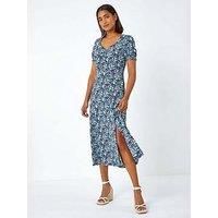 Ditsy Floral Ruched Stretch Midi Dress from Roman. Add a day dress to your wardrobe with this feminine floral tea dress, featuring gathered detailing on the sleeves and front of the dress that forms a flattering sweetheart neckline. This day dress is the perfect wardrobe staple to take you from day-to-night, season-to-season. Layer with a denim jacket for a look that's perfect for summer garden parties and evenings on holiday! | Roman Women's Ditsy Floral Ruched Stretch Midi Dress in Green | Size: 10 - Manufacturers part numbers: 140860p|WH49B