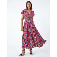 Roman Floral Ruched Waist Midi Dress Say hello to your new favourite Summer dress with this tie belt midaxi length dress. The fit and flare silhouette features a thick ruched waistline to flatter your figure, while the v-neckline and short sleeves add a touch of elegance. Perfect for warmer days, the vibrant floral print and wooden button details at the bust make this dress a sweet addition to your daywear. Complete the look with sandals and a denim jacket for effortlessly chic Summer vibes! Material Co...