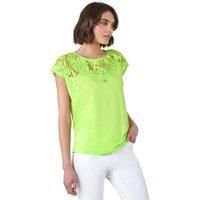 Embellished Palm Print Cut Out T-Shirt from Roman. Basic t-shirts are a wardrobe necessity and this piece has an interesting edge with its burnout palm print yoke and sparkling embellishment. Cut from a relaxed, jersey fabric, this piece features a modest round neckline and short sleeves. Designed to pull on overhead this top is perfect with cropped stretch trousers and sandals for an effortless Spring Summer look! | Roman Women's Embellished Palm Print Cut Out T-Shirt in Lime | Size: 12 - Manufacturers part number: Roman_5063026709369