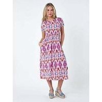 Roman Petite Aztec Print Stretch Pocket Midi Dress Turn heads in this vibrant aztec print midi dress from our Petite range, perfect for transitioning from Spring to Summer. Designed in a flattering stretch jersey fabric, this day dress features a classic round neckline, short sleeves and side pockets. The midi length gathered skirt creates a feminine silhouette, making it easy to pull on and go. Elevate your casual look by styling it with a denim jacket and sandals for an effortlessly stylish warm weath...