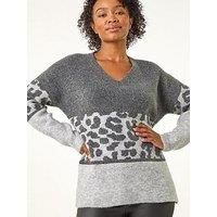 Petite Animal Print Colourblock Jumper from Roman. Embrace your wild side this Autumn and Winter with this fabulous animal print jumper. Crafted from a soft stretch knit, this will keep you warm during the cooler months ahead. It features a playful colour block design with an animal print and shimmering stripe detail. This jumper is finished with a feminine v-neckline and cosy full-length sleeves. Pair with dark denim and ankle boots for a stylish and fun look! | Roman Women's Petite Animal Print Colourblock Jumper in Grey | Size: 16 - Manufacturers part number: Roman_5063026815305