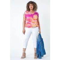 Curve Abstract Overlay Bubble Hem Top from Roman. Spring Summer dressing just got easier with this Curve overlay top. With a stretchy jersey inner lining for all-day comfort, a chiffon overlay, and a tie detail at the shoulders, this top adds a pop of colour to your everyday outfit. The printed layer is cinched in at the waist with a flattering elasticated bubble hem, creating a feminine and floaty fit. Finished with a round neckline and a wrap front silhouette, this top is perfect for beachside cocktails or a chic day out paired with cropped trousers, wedges, and a clutch bag! | Roman Women's Curve Abstract Overlay Bubble Hem Top in Pink | Size: 30-32 - Manufacturers part number: Roman_5063026817750