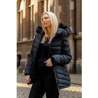 Faux Fur Hooded Quilt Coat from Roman. Get ready to stay warm in style with this chic faux fur hooded coat. Featuring cosy chevron quilted detailing, this coat is perfect for the Autumn/Winter season. The vertical welt pockets and exposed zip fastening add a modern touch to this classic design. Layer over your favourite knitwear and jeans for a stylish yet practical look that will keep you snug all season long! | Roman Women's Faux Fur Hooded Quilt Coat in Black | Size: 18 - Manufacturers part number: Roman_5063026819228
