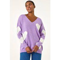 V-Neck Heart Detail Knit Jumper from Roman. Add a touch of love to your Autumn/Winter wardrobe with this delightful heart print v-neck jumper. This jumper features a flattering V-neckline and comfy long sleeves. Perfect for casual days, simply pair with your favourite jeans and stylish ankle boots for a cosy and stylish look! | Roman Women's V-Neck Heart Detail Knit Jumper in Lilac | Size: 12 - Manufacturers part number: Roman_5063026877082