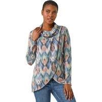Cowl Neck Snit Top from Roman. Stay stylish and snug this Autumn in this cowl neck top. Crafted from a soft knit fabric, this top features a flattering cowl neckline and a chic cross-over layer for added detail. With long sleeves and an eye-catching all-over print, this top is perfect for adding a touch of seasonal charm to your wardrobe. Pair with jeggings and ankle boots for a casual yet fashionable look this season! | Roman Women's Cowl Neck Snit Top in Blue | Size: 14 - Manufacturers part numbers: Roman_5063026885315|191101p