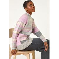 Stripe Colour Block Knitted Jumper from Roman. Wrap up warm this Autumn Winter in our stylish stripe colour block jumper. Knitted in a soft mix fabric, this jumper features a bold colour block print in a flattering stripe style. The design includes a cosy funnel neckline, raglan long sleeves, and finishes in a classic jumper shape. Complete your outfit by pairing it with jeggings and ankle boots for a trendy look! | Roman Women's Stripe Colour Block Knitted Jumper in Light Grey | Size: 12 - Manufacturers part numbers: 161333p|WPHUZ