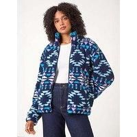 Nordic Print Funnel Fleece Jacket from Roman. Stay cosy and stylish this Winter with our Nordic print fleece. Featuring a snug funnel neck and a practical zip through front, this fleece offers warmth and comfort. The eye-catching vibrant Aztec print adds a touch of personality to this winter essential. Complete with full-length sleeves, this fleece is perfect for layering over your favourite outfits. Pair with jeans and trainers for a trendy daytime ensemble that's sure to keep you warm and on-trend. | Roman Women's Nordic Print Funnel Fleece Jacket in Midnight | Size: 16