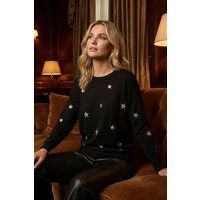 Star Glitter Print Knit Jumper from Roman. Embrace the celestial charm this Autumn Winter season with our star glitter print jumper. Crafted from a mix of comfortable knit fabric, this piece features a classic crew neckline and long sleeves to keep you warm. The stars add a touch of sparkle to your everyday outfit. Pair with jeggings and ankle boots for a trendy and effortless look! | Roman Women's Star Glitter Print Knit Jumper in Black | Size: 12 - Manufacturers part numbers: Roman_5063026909295|160265p