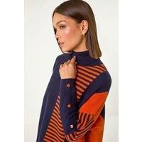 Stripe Colour Block Jumper from Roman. Make a bold statement this Autumn/Winter with this chic stripe colour block top. The eye-catching design features a stylish roll neck and flattering long sleeves for added warmth. Perfect for layering under jackets or wearing on its own, this top is a versatile addition to your wardrobe. Pair with your favourite jeans and ankle boots for an effortless and stylish look. | Roman Women's Stripe Colour Block Jumper in Midnight | Size: 18 - Manufacturers part number: Roman_5063026913278
