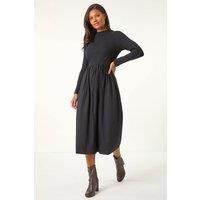 Cotton Stretch Jersey Mix Midi Dress from Roman. Add sophistication to your Autumn Winter wardrobe with our mix fabric stretch midi dress. Featuring a flattering round neckline and long sleeves, this versatile dress boasts a fit and flare silhouette that finishes elegantly at midi length. Complete with practical side pockets and a gathered waist for added shape, this dress is the perfect combination of glam and comfort. Style up or down with boots or trainers and layer with a jacket for the ultimate fall look! | Roman Women's Cotton Stretch Jersey Mix Midi Dress in Black | Size: 14 - Manufacturers part numbers: Roman_5063026949734|141828p