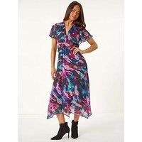 Petite Print Twist Front Dobby Midi Dress from Roman. Elevate your occasionwear with our charming Petite twist dobby dress, perfect for the cooler season. This dress features a flattering v-neckline and short set-in sleeves. The playful twist detail at the waist creates a flattering fit and flare silhouette, crafted from a comfortable woven dobby spot fabric layered over an abstract print. For a glamorous look at your next special event, pair with a bolero and strappy heels!
