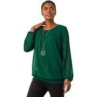 Chiffon Banded Hem Pleated Top from Roman. Elevate your Autumn/Winter wardrobe with this chic pleated top. Featuring a classic round neck and intricate pleated detailing at the front neck, this top is a true standout piece. The long sleeves with elasticated cuffs, banded hem, and contrasting fabric composition of jersey inner and chiffon woven outer create a perfect blend of comfort and style. With delicate chiffon sleeves adding an elegant touch, pair with jeans and ankle boots for casual sophistication. | Roman Women's Chiffon Banded Hem Pleated Top in Green | Size: 10 - Manufacturers part number: Roman_5063026977935