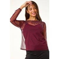 Embellished Sequin Mesh Top from Roman. Add some sparkle to your Autumn/Winter wardrobe with this dazzling sequin mesh top. Featuring long sleeves, a stylish slash neckline, this top is perfect for a night out. The sequin trim on the yoke and sleeves adds a touch of glamour to your ensemble. Pair with pleather trousers and heeled boots for a party ready look that will have you turning heads all night long! | Roman Women's Embellished Sequin Mesh Top in Wine | Size: 20
