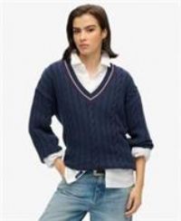 Superdry Oversized V-Neck Cricket Knit Jumper. 'Preppy' and 'comfortable' are written all over the Oversized V-Neck Cricket Knit Jumper, for all the right reasons. Crafted with a V-neckline and a cable knit design.
