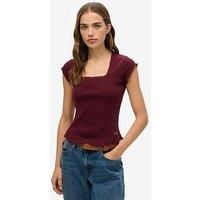 Superdry Essential Square Neck Short Sleeve Tee Size & Fit True to size - order your usual size Regular fit Available in sizes 8 - 16 Details Essential Square Neck Short Sleeve T-Shirt by Superdry Red Rib detail Short sleeve Square neck Embroidered logo to hem Frilled neckline and hem Material & Care Material Content: Body-cotton 100% - Manufacturers part number: 5580638