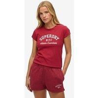 Superdry Athletic Essential Slub Tee Size & Fit True to size - order your usual size Slim fit Available in sizes 8 - 16 Details Athletic Essential Slub Tee by Superdry Bordeaux Red Logo print across the chest Capped sleeves Crew neckline Material & Care Material Content: Body-cotton 100%