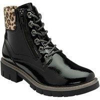 If you are drawn to leopard print, then youll certainly be attracted to the Charleston ankle boot from Lotus. With metal eyelets, hiker laces and a heavy cleated sole unit its easy to see that this ladies lace-up ankle boot takes styling references from a walking boot. The application of leopard print on the padded ankle collar and a decorative zip makes this glossy patent boot an on-trend new season offering. | Lotus Women's 'Charleston' Patent Ankle Boots in Black | Size: 6