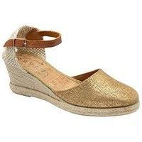 Ravel Vista Wedge Shoes - Gold Leather Step into summer wearing Ravel's Vista. This made in Spain women's espadrille features a leather upper, an elegant almond toe, a contrasting woven heel panel with gold thread and an adjustable leather ankle strap. Heel Height: up to 2.5 Inch Material Content: Upper: Leather. Lining / Sock: Leather / Synthetic. Sole: Synthetic. Lining: Leather Sole: Other Materials Upper: Leather Womens Shoes Fitting: Standard - Manufacturers part number: Ravel_5063075359492