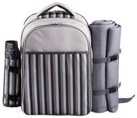A complete on-the-go option for outdoor adventures. This smart grey striped backpack has plenty of space for all your picnic needs. Including, glasses, cutlery and plates. It even comes with its own matching picnic rug strapped to the side. Soft on top with a waterproof backing, just roll it out, sit down and dig in. The product is light and easy to carry. PE backing is waterproof and easy to wipe. Made in China. 50% recycled polyester, 50% polystyrene. Wipe clean. Size L135, W115cm. Size of runner L135...