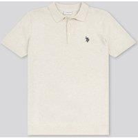 The 'Combed Cotton Polo Shirt' by U.S. Polo Assn. blends timeless style with modern comfort. Made from 100% breathable combed cotton, it features a 3-button placket, ribbed trims, and signature Double Horsemen embroidery. A tricolour neck detail adds a distinctive touch, making it ideal for both smart-casual and off-duty looks. Model is 6'0" with a chest measurement of 38.5cm and wears a size medium. | U.S. POLO ASSN. Men's Combed Cotton Polo Shirt in Medium Beige | Size: XL