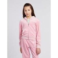 Juicy Couture Girls Mini Diamante Velour Zip Through Hoody Size & Fit Regular fit Available in sizes 7-8 years - 15-16 years Details Girls Mini Diamante Velour Zip Through Hoodie by Juicy Couture Light Pink Long sleeves Side slip pockets Diamante logo front and back Material & Care Material Content: 95% Polyester, 5% Elastane Washing Instructions: Machine Washable