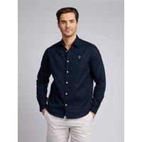 The U.S. Polo Assn. mens Linen Blend Shirt combines lightweight comfort with timeless sophistication. Made from a breathable linen-cotton blend, it features a French placket and embroidered Double Horsemen logo for added heritage style. Ideal for warm-weather outings, this shirt pairs effortlessly with chinos or tailored shorts for a relaxed yet polished look. | U.S. POLO ASSN. Men's Linen Blend Shirt in Dark Navy | Size: Medium