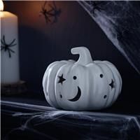 A charming t-light holder in a white pumpkin design, complete with a matt finish and star cut out details. Perfect for allowing the warm glow to fill your space. These beautiful White ceramic pumpkins are the perfect display piece to your home, they look perfect as a set or you can dot the individual ones around your home. Size H12, W14, D14cm. Contains Ceramic Pumpkin. 12m lead length between plug and decoration. Suitable for indoor use. Manufacturers 1 year guarantee. EAN:5063225160077.
