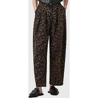 AllSaints Becca Denim Trouser Size & Fit True to size - order your usual size Wide leg fit Available in sizes 8 - 16 Details Becca Denim Trouser by AllSaints Brown Leopard print Wide leg fit Pleated at the front and hem High-rise Two pockets Clean hem Button and zip front fastening Material & Care Material Content: Cotton(63);Lyocell(37) Washing Instructions: Machine Washable