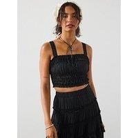 AllSaints Talia Top Size & Fit True to size - order your usual size Regular fit Available in sizes 8 - 16 Details Talia Top by AllSaints Black Shirred fabric Square neckline Wide lace trim shoulder stap Frill detail Material & Care Material Content: Viscose(100) Washing Instructions: Machine Washable
