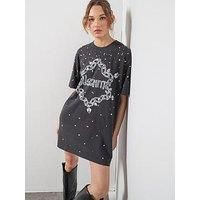 AllSaints Drip Scatter Dress Size & Fit True to size - order your usual size Regular fit Mini length Available in sizes XS - L XS: UK 2-4 - Bust 30-31", Waist 23-24", Hip 33-34" S: UK 6-8 - Bust 32-33", Waist 25-26", Hip 35-36" M: UK 10-12 - Bust 35-37", Waist 28-30", Hip 38-40" L: UK 14-16 - Bust 39-41", Waist 32-34", Hip 42-44" Measurement from shoulder to hem: 84cm Details The Drip Scatter Embellished Mini Dress adds a statement touch to everyday styling. Defined by its bold screen-printe...