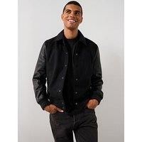 AllSaints All Saints Endleton Mixed Media Bomber Jacket Size & Fit True to size - order your usual size Regular fit Regular length Measurements (from CB to hem): 67.50cm Available in sizes S - 2XL (S:36", M:38", L:40", XL:42", 2XL:44") Details All Saints Endleton Mixed Media Bomber Jacket by AllSaints Black Bomber collar Long sleeves with elasticated cuffs Press stud closure with concealed buttons Long sleeves Side slip pocket Ribbed trims Western seam detailing Material & Care Material Content: Wo...