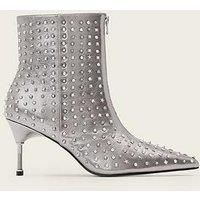 AllSaints Natasha Stud Boot Size & Fit Standard fit Available in sizes 3 - 8 Details Natasha Stud Boot by AllSaints Silver Pointed toe with ankle boot height All-over stud detailng Stiletto heel inspired by industrial hardware Front zip fastening Material & Care Material Content: Cow Leather(100)
