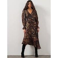 AllSaints Dannie Dress Size & Fit True to size - order your usual size Regular fit Midi length Available in sizes 8 - 16 Details Dannie Dress by AllSaints Brown The AllSaints Dannie Dress captures effortless sophistication in signature style. Designed in the striking Pardus Flame print, it drapes beautifully with soft ruffles and a fluid silhouette that moves with ease. V-neckline with subtle pleat detailing Long sheer sleeves with elasticated cuffs Asymmetric hem for a modern finish Material & Care Mat... - Manufacturers part number: WSQPF