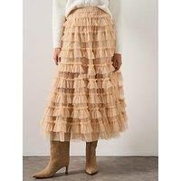 AllSaints Aude Ruffle Skirt Size & Fit True to size - order your usual size Ruffled fit Maxi length Measurements (taken from CB to hem): 98cm Available in sizes 8 - 16 Details Aude Ruffle Skirt by AllSaints Pink Pull-on style Tiered tulle skirt Elasticated waistband Material & Care Material Content: Polyester(100) - Manufacturers part number: W071RD