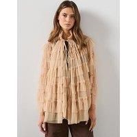 AllSaints Aude Ruffle Cape Size & Fit Available in one size Details Aude Ruffle Cape by AllSaints Pink Mesh fabric Funnel neck Tie front fastening Tiered ruffle design Material & Care Material Content: Polyester(100)