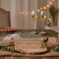 * All because two people fell in love sentiment* Mr & Mrs cut out text* Wooden freestanding plaque* Artificial flower decoration This freestanding wooden plaque from Love Story would be a heartwarming gift for newlyweds. Mr & Mrs cut out text is displayed above the text All because two people fell in love. The wooden toned plaque and artificial flower decoration with rustic bow would pair wonderfully with a boho style. - Manufacturers part numbers: WG1239|30937195