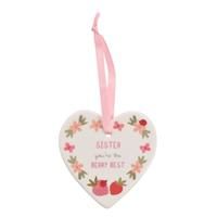 * Floral Inspired Design* Heart Shaped Plaque/Decoration* Pink Ribbon Hanging* Made from Smooth Ceramic Meet the Sister Ceramic Heart Hanging Plaque, a sweet and simple decoration that makes for a great extra gift. Heart shaped, this plaque is made from smooth white ceramic; features a heartfelt quote and a floral design; and is the perfect way to make any Sister feel appreciated. - Manufacturers part number: 30984539