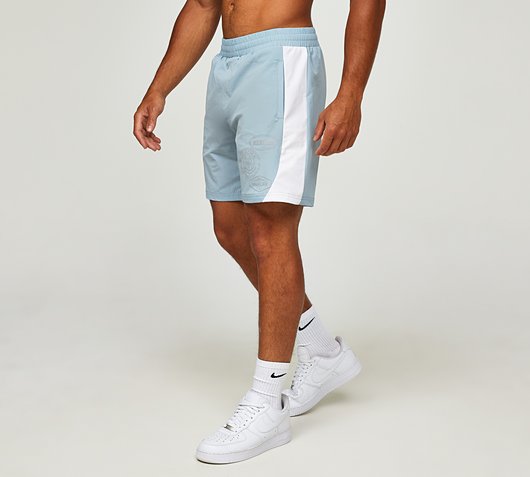 Mercier Contrast Badge Woven Shorts in Blue and White. Footasylum Exclusive. Step out in style this summer as Mercier introduce streetwear fit for a king. With an elasticated adjustable drawstring waistband for a snug personalised fit, convenient side pockets to stash away those small essentials, contrast side detail and signature repeat Mercier logos to left leg. Regular fit. Blue Size - L