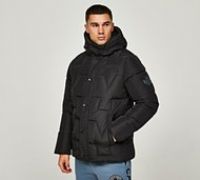 Zavetti Canada Orenza Puffer Jacket in Jet Black. Facing off to winter in style, the chills and dreary grey skies come off second best thanks to this toasty padded puffer jacket that has a sustainable filling. With a full zip fastening front, popper fastening storm flap, toggle adjustable hood, elasticated cuffs, secure zip fastening pockets complete with maple leaf zip pulls and large reflective maple leaf logo to left sleeve. Regular fit. Black Size - XL