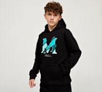 Metissier Junior Fragment Overhead Hoodie in Jet Black. Stay stylish and comfortable with the Metissier Junior Fragment Overhead Hoodie. Featuring a bold M graphic on the chest with vibrant, fragmented design details, this hoodie is perfect for young trendsetters. Crafted from premium fabric, it offers warmth and softness, making it ideal for everyday wear or outdoor adventures. The overhead design includes a spacious kangaroo pocket and a snug hood for added coverage. Black Size - XL/B