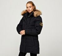 Zavetti Canada Womens Goshawa Puffer Parka Jacket in Black. Heavyweight winter styling with a classic faux fur hooded design and longer parka style cut, an insulated inner blocks out the cold chills. With a zippered front and maple leaf branding. Black Size - XL