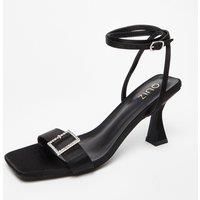These black satin buckle heels feature a flared design and an open toe, providing a stylish look for various occasions. The square toe adds a modern touch to your footwear collection. | Quiz Women's Black Satin Buckle Heels | Size: 4 - Manufacturers part number: Quiz_5063331080276
