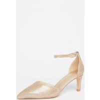 Quiz Wide Fit Gold Diamante Court Heels - Diamante embellishment - Ankle strap - Pointed toe - Court style - Heel height: 6.5 cm / 2.7 inches approx - Excluding trims Lining: Textile/Other Sole: Other Materials Upper: Other Materials Diamante embellishment Ankle strap Pointed toe Court style Heel Height: 6.5 cm / 2.7 inches approx Excluding Trims - Manufacturers part number: Quiz_5063331149386